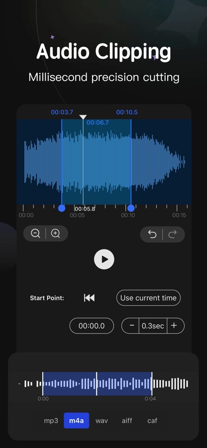 • Формат сохранения: поддержка mp3 , m4a, wav, m4r, caf, aiff, aifc, aac, flac