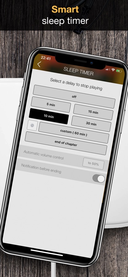• Таймер сна с возможностью задания разных периодов либо до конца главы.