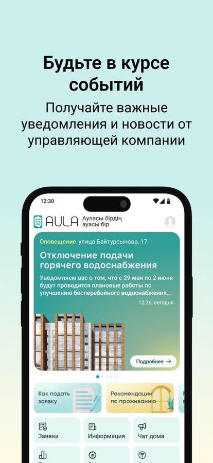 В AULA вы можете общаться с соседями, публиковать посты, подавать заявки в управляющую компанию и получать уведомления. Это социальная сеть вашего дома.