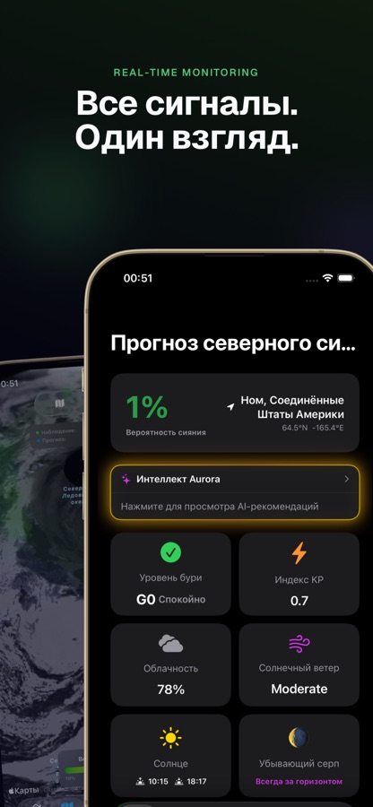 Неважно, опытный ли вы охотник за северным сиянием или надеетесь увидеть его впервые — Aurora Forecast помещает науку о космической погоде и нативный интеллект Apple в ваш карман.