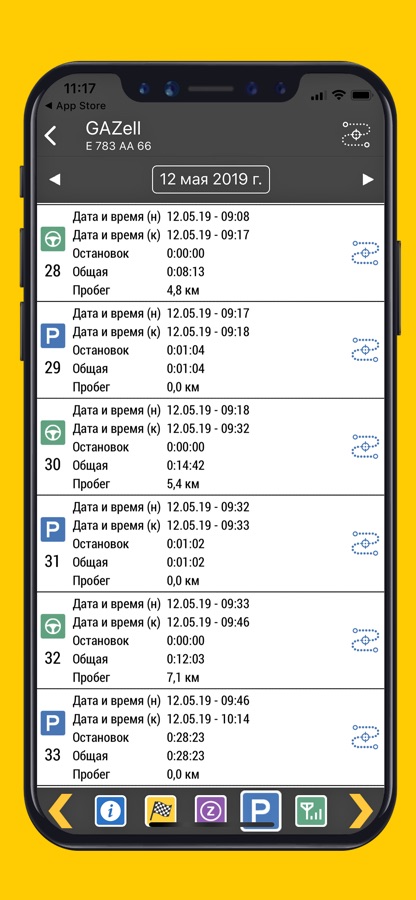 •Отображение трека (маршрута движения) и событий на карте за заданный интервал времени
