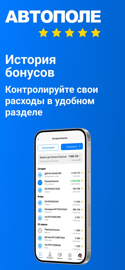 — Управление бонусами: просмотр списаний и начислений, пополнение баланса, электронные чеки