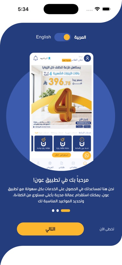 حرصا من شركة الدولية علي خدمة عملاؤها , تقدم لكم تطبيق عون للخدمات المنزلية , حيث يتم تقديم الخدمات المختلفة من (تنظيف — غسيل ملابس — كي — رعاية مسنين وأطفال — صيانة منازل وغيره) , يتم تقديم الخدمات من خلال مجموعة من الباقات المختلفة بأسعار تنافسية عن طريق مجموعة من محترفات النظافة المدربين علي أعلي مستوي من الدقة والمهنية .