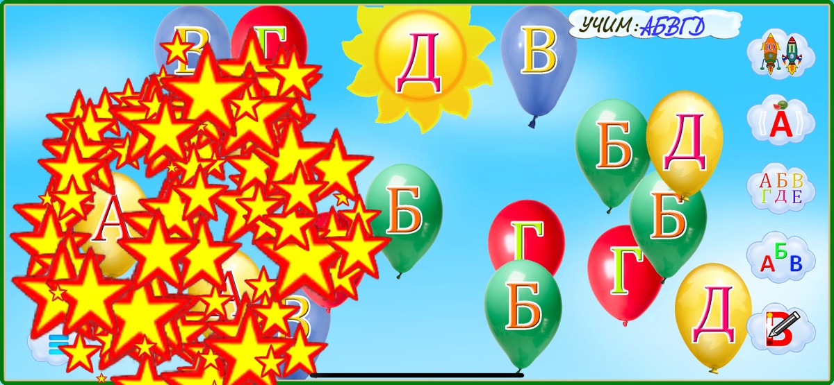 Эта игра для закрепления изучаемых букв в игровой форме. На экране появляются шарики с буквами и дается задание — буква, которая произносится и пишется посередине экрана на солнышке. Ребенку надо найти требуемую букву на шарике и нажать на неё, шарик лопнет. Задание считается выполненным после лопанья 7 шариков. После этого задания буква меняется, даются новые шарики с перемешанными буквами. Каждый раз буквы меняются случайным образом.