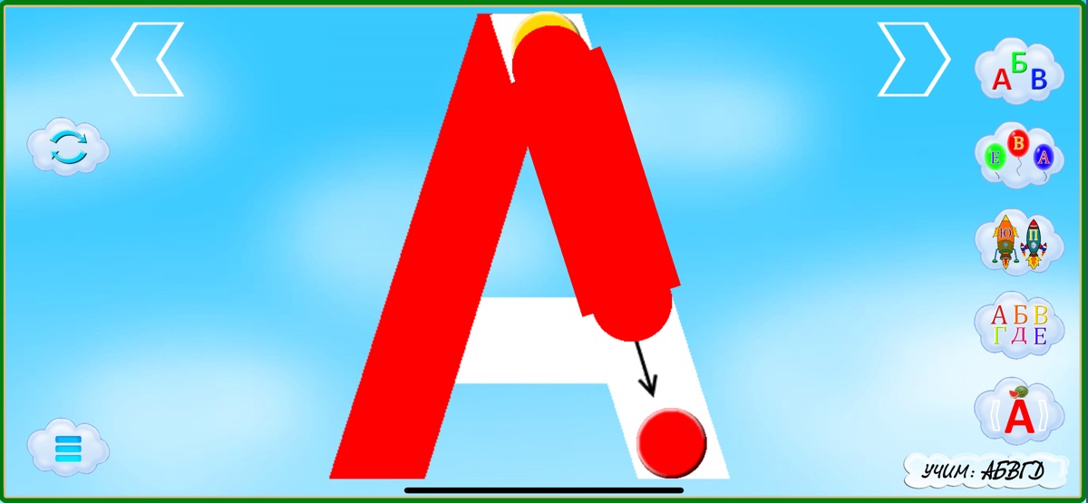 Здесь малыш учится писать буквы, для правильного написания буквы, каждый элемент буквы снабжён стрелкой показывающей направления движения пальца и двумя кружочками: желтый для начала, красный для конца. Для облегчения написания, сложные буквы разбиты на несколько элементов букв.