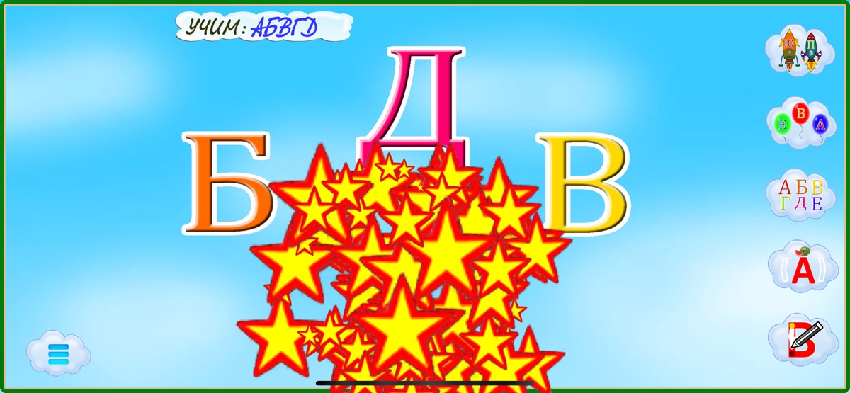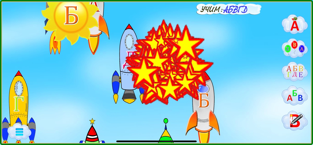 Эта игра также для закрепления изучаемых букв в игровой форме. Экран представляет собой небо куда поднимаются ракеты неся на себе буквы. Даётся задание — буква, которая произносится и пишется на солнышке. Буквы с ракетами летят постоянно вверх и малышу надо успеть найти на ракете требуемую букву и нажать на ракету.