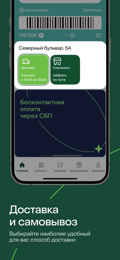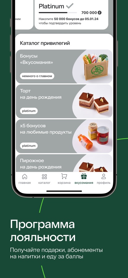 Оформите виртуальную карту лояльности «Вкусомания» в приложении «Азбука вкуса» и получайте бонусы за участие в акциях, викторинах и квестах, за совершение покупок в магазине или при оформлении заказа. Приобретайте за бонусы различные товары, абонементы на завтраки и обеды, на чай, кофе и другие напитки.