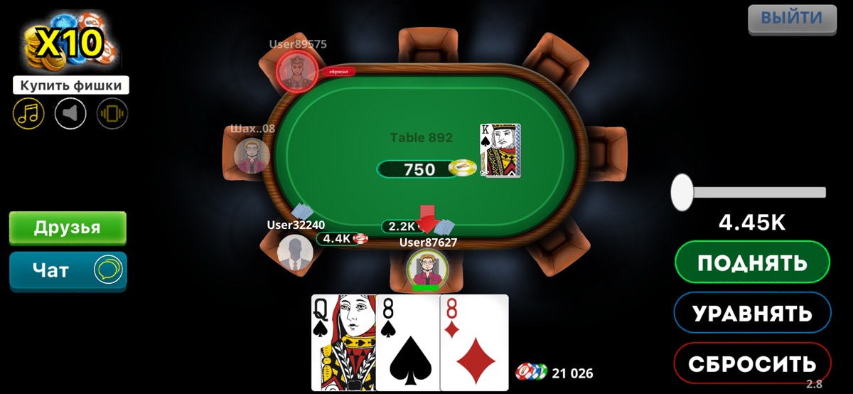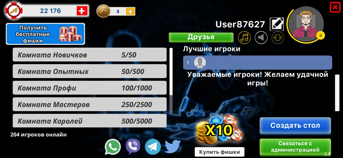 В игре можно выбрать стол по своему уровню игры или открыть свой стол, пригласив друзей или любых игроков. Общайтесь, развивайте логику и выплескивайте свой азарт в игру.