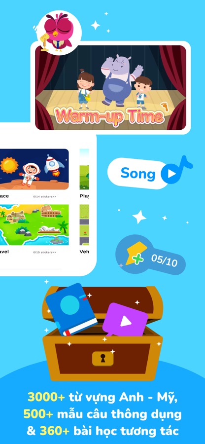 3.000 từ vựng, 500 mẫu câu được giới thiệu theo ngữ cảnh một cách tự nhiên thông qua các bài hát, câu chuyện giúp bé tiếp thu tốt và ghi nhớ lâu.