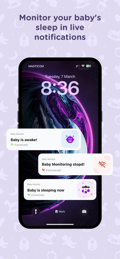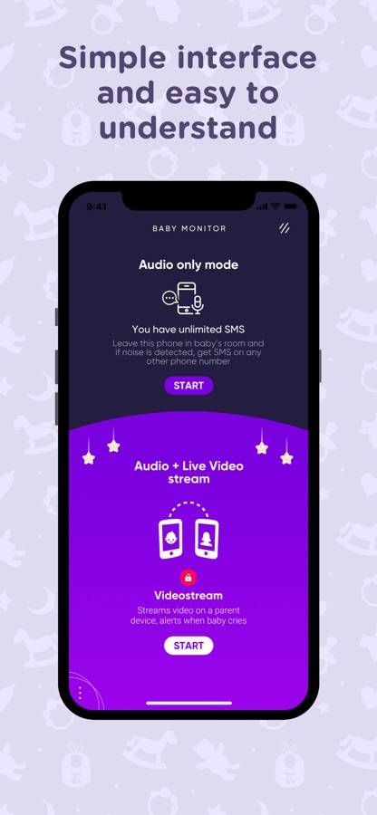 В случае громкого звука, аппликация отправляет СМС сообщения на указанный номер, на любой телефон. Про покупке про функционала, можно наблюдать за ребенком при помощи камеры, и даже удаленно запускать любимые колыбельные песни .