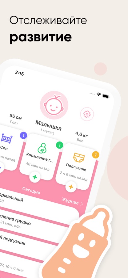 Приложение поможет отлеживать развитие вашего малыша. Вы можете следить за сном малыша. Сколько он спит, соблюдается ли режим. Грудное вскармливание. Сколько и как часто кушает ваш малыш. Смена подкузника и сцеживание молока. Помимо этого вы можете сохранять записи о здоровье малыша: температура, болезни, прививки и посещение врача. Также добавляйте записи о настроении малыша и важных событиях в его жизни, например, первое слово, первый смех и тд. Записывайте изменение веса, роста и размера головы.