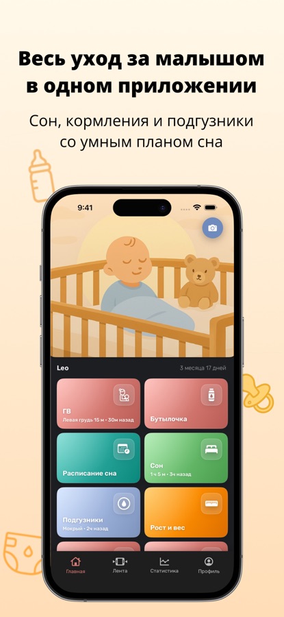 — Понятные сводки: смотри закономерности сна, кормлений и подгузников в дневных, недельных и месячных обзорах.