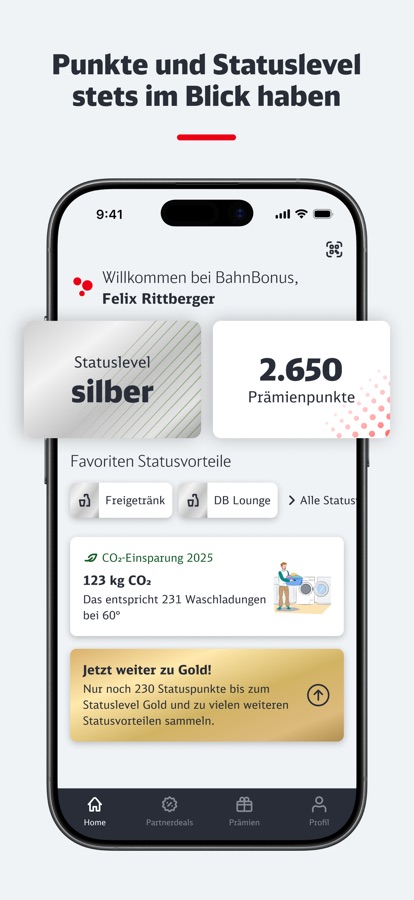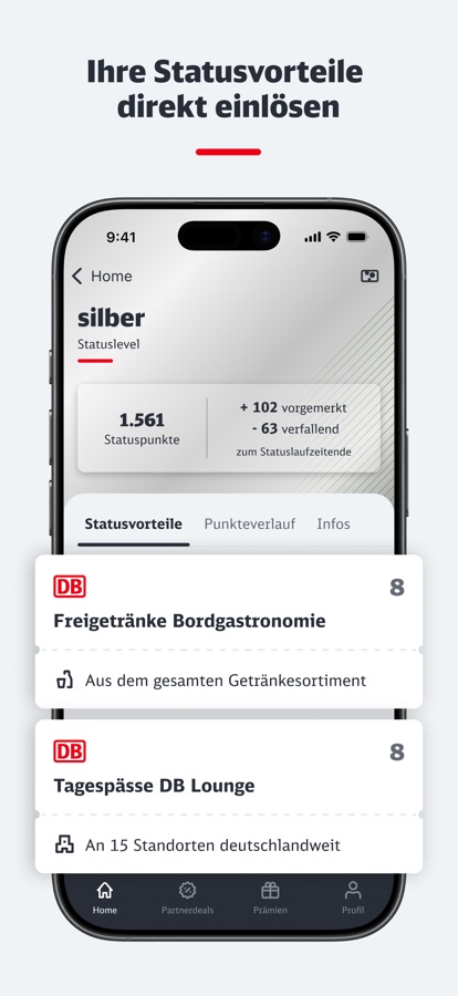 Und ganz exklusiv: nur über die BahnBonus App können alle Statusvorteile genutzt werden. Das Statuslevel Silber kann bereits ab 1.500 Statuspunkten erreicht werden. Als Statuskunde können Sie Ihre Vorteile über die App einlösen und erhalten so zum Beispiel Freigetränke im Zug, Zugänge zu den DB Lounges und Freiminuten bei Call a Bike.