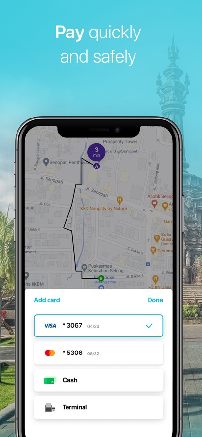 BaliCab provides safe and convenient transport and logistics in Bali. Each time you grab a taxi ride, city tour, airport transfer, or order through Mlanjo, you can review the driver or courier’s name and vehicle information before your trip or delivery starts. We ensure a safe and comfortable experience from start to finish.