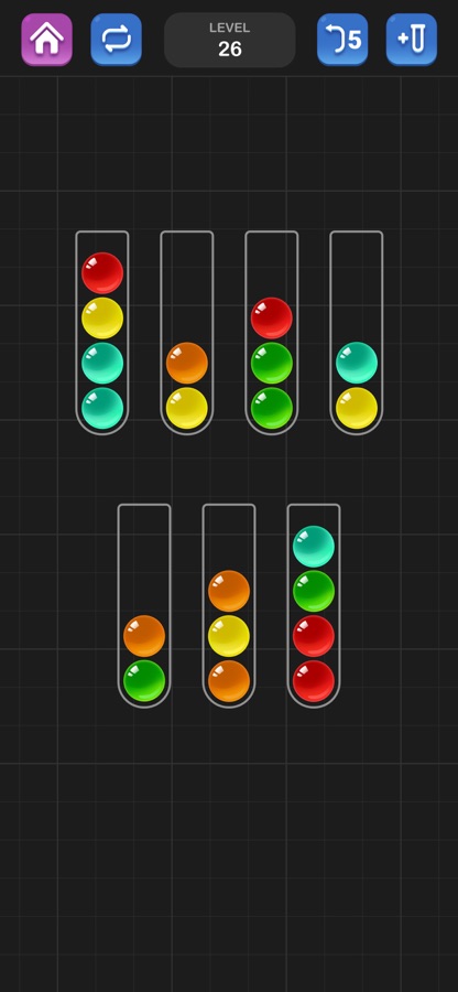 Эта сложная, но расслабляющая игра по сортировке мячей никогда не надоест вам, когда вы будете решать головоломки с сортировкой по цвету. Поделитесь нашей игрой для тренировки мозга со своей семьей и проведите целый день, развлекаясь и расслабляясь с семьей, сортируя цвета.