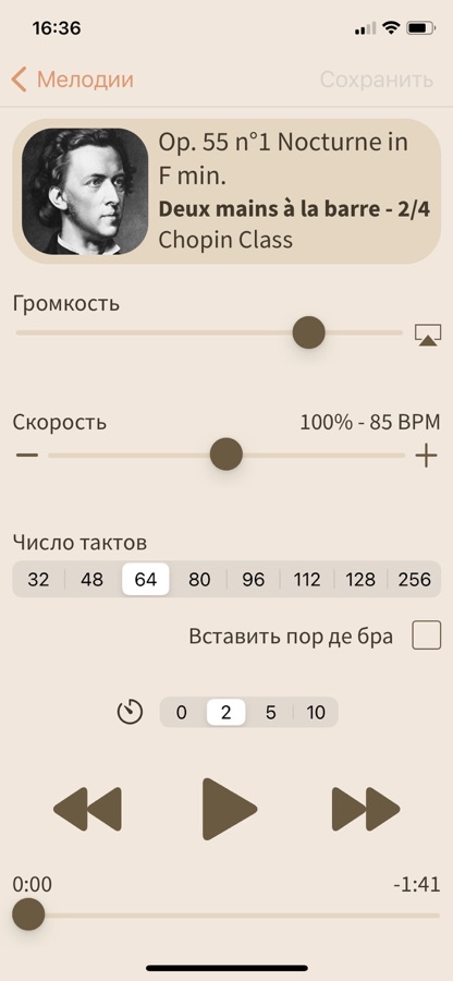 Выберите мелодию, установите скорость и количество тактов, чтобы приспособить ее к своему упражнению и начинайте урок танцев под аккомпанемент прекрасной музыки Ballet Class — вашего персонального аккомпаниатора!