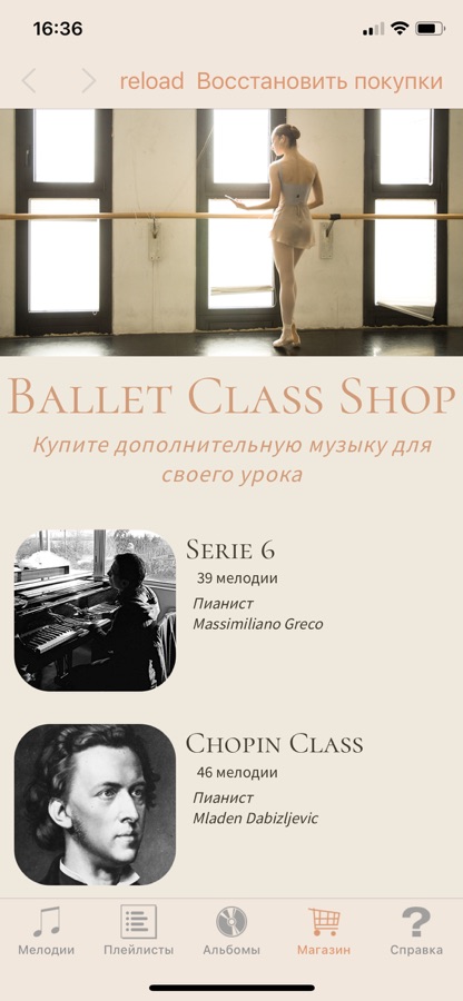 Музыка под любой танцевальный шаг, идеальная для использования в ежедневных занятиях в вашей школе танцев. Самое лучшее приложение, которое дает вам возможность использовать фрагменты классической музыки, сыгранные на на фортепиано, чтобы персонализировать ваши уроки танцев. Вот Ballet Class.