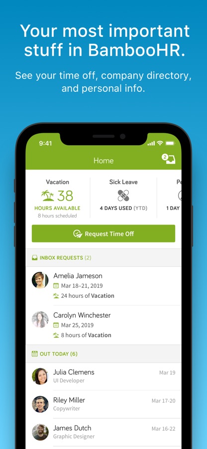 BambooHR is online HR software for small and medium-sized businesses that have outgrown spreadsheets. We automate many of the most tedious HR functions and free you up to do meaningful work. The BambooHR app lets you take some of those most important functions with you, and makes your most common tasks in BambooHR simple and fast.