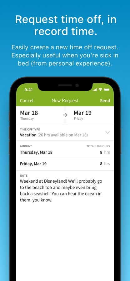 Planning a trip? Request time off when you’re out and about. Leave requests can be submitted in the app, and if you’re an approver, you can approve them there as well.