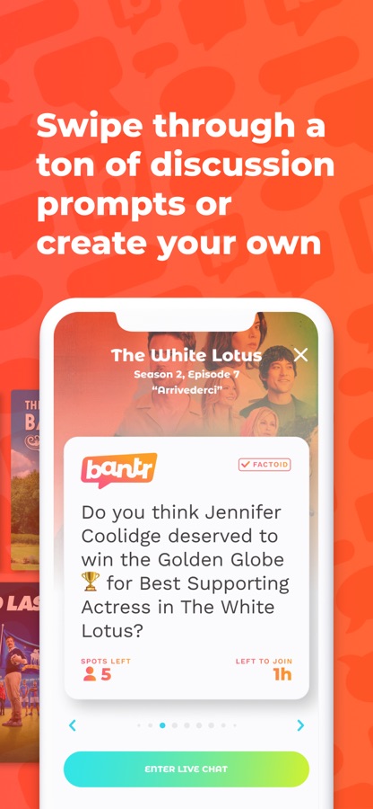 Let’s talk TV! Bantr is a social network for television fans. Comment, rant, commiserate, bond, and bantr about the shows you love with other fans who love them, too. Swipe through episode-specific discussion topics and join small group conversation or create some prompts of your own and get bantring.