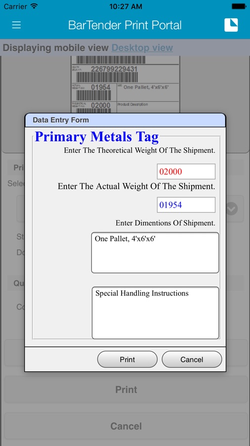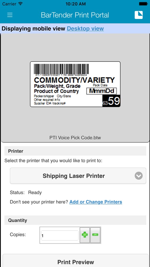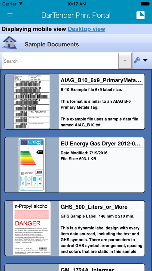 Print professional labels directly from your iPhone or iPad through your BarTender Enterprise Automation system. Easily choose BarTender documents, enter print-time data or select options through customizable forms, and print from your iOS device to any printer on the internet with ease and security.