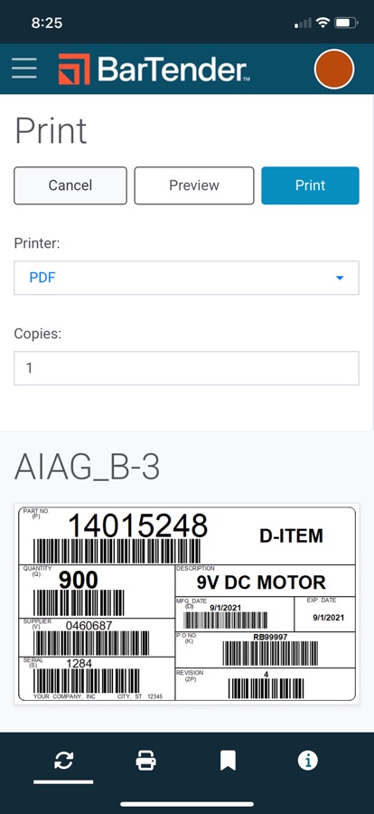 BarTender provides easy, fast and secure mobile printing of documents, barcode labels and RFID tags at your source of work. The app works with active BarTender Print Portal (BarTender 11.4, 2022, 2021) or BarTender Cloud to print existing labels directly from a mobile device.