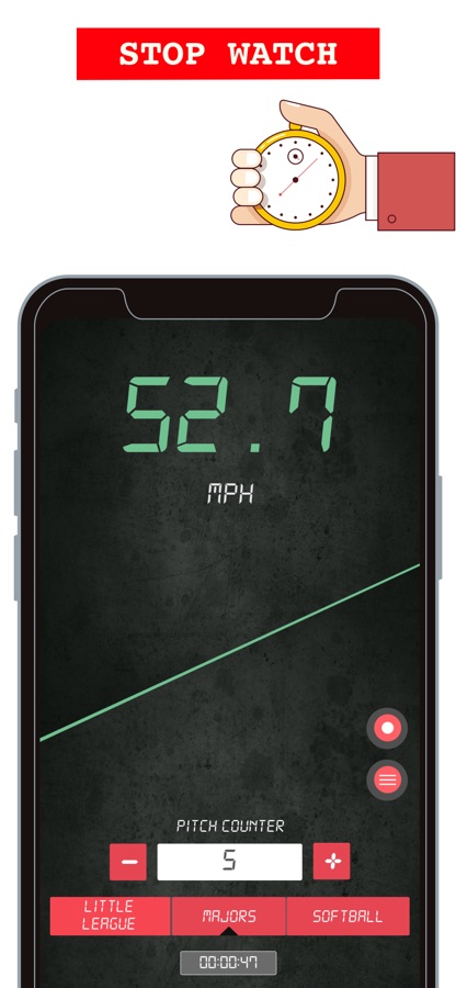 ► Pitch history. No need to write down the times yourself, Baseball Speed Radar Gun remembers the last 5 pitches at minimum.