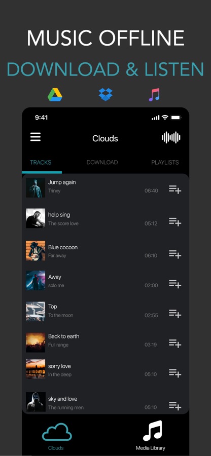 + Загрузите музыку из собственной библиотеки или из облака (Dropbox, Google Диск)