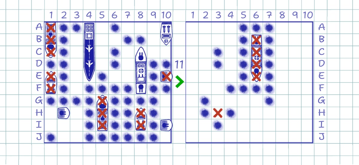 Ходят (стреляют) игроки по очереди. Если игрок попал в корабль противника, то стреляет еще раз. Если промахнулся – переход хода. Побеждает тот, кто первый потопил все кораблики.