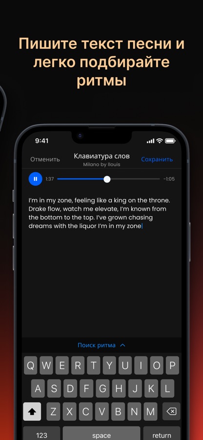 Организация потока: Пишите текст песни и ищите ритмы на нашей встроенной словесной клавиатуре и создавайте без ограничений плейлисты для подготовки последующих проектов.