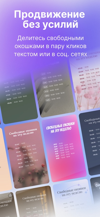 Легко оптимизируйте свое рабочее время благодаря нашему удобному календарю с интуитивно понятной и быстрой настройкой расписания. Вы сможете легко создавать, переносить, отменять и удалять записи, а также делиться свободными окнами для записи в мессенджерах и соцсетях всего в несколько касаний. А еще вы сможете планировать перерывы, выходные и личные дела, чтобы лучше управлять своим временем!
