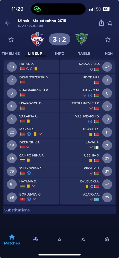 · Хронология событий матча: голы, желтые/красные карточки, замены, время начала/окончания первого/второго тайма и прочее