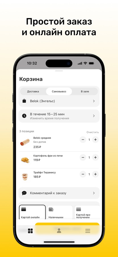 Как сделать заказ в приложении “Belok”: выберите понравившиеся позиции из меню, добавьте их в корзину и перейдите на экран оформления заказа (по нажатию на иконку корзины).