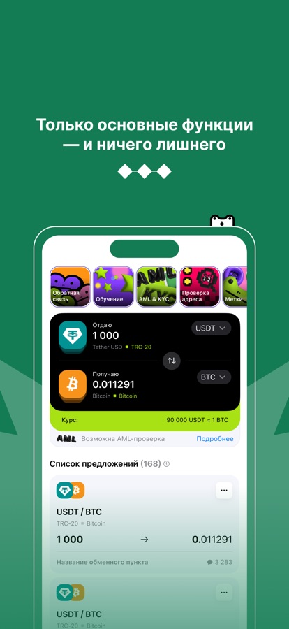 Быстро находить выгодный курс крипты на сегодня для обмена на цифровые или наличные деньги — надо только указать валютную пару. А чтобы новичкам легче было разобраться в том, как обменять криптовалюту, в приложении есть инструкция;