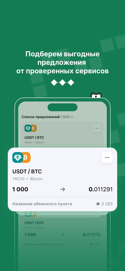 Выбирать любые валюты — один обменник криптовалют работает с ограниченным набором валютных пар, а в нашем приложении можно найти предложения обмена для различных платежных единиц. BestChange покажет, где выгодно обменять биткоин, купить ethereum, каков текущий курс tether, ltc и многое другое;
