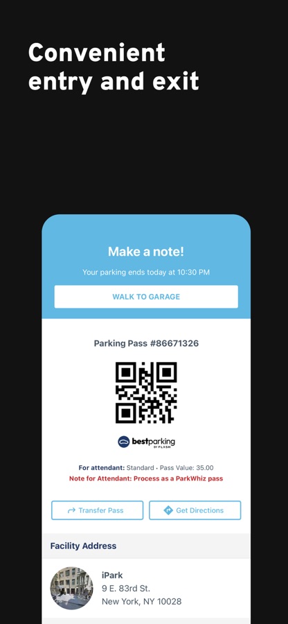 • After reserving a space, enter your garage or lot easily with your digital parking pass and park your car in seconds.