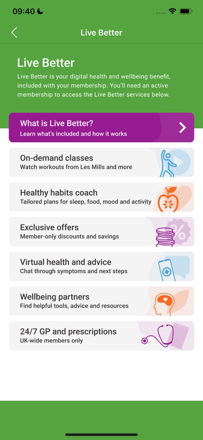 — Access Live Better: on-demand workouts from Les Mills and Wexer, healthy habits coaching powered by Holly Health and access 24/7 GP and health support with Abi Health
