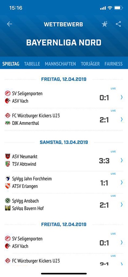 • Live- und Endergebnisse, Tabellen, Torschützen und Spielansetzungen Deiner Favoriten und aller anderen Ligen, Teams und Vereine in Bayern