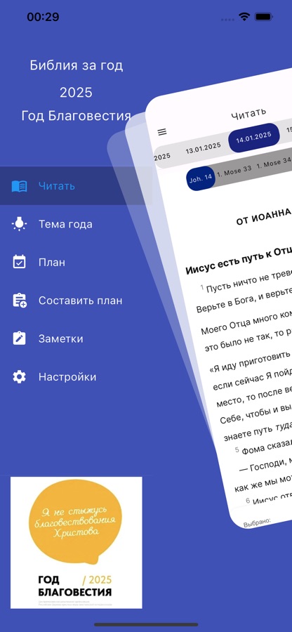 Согласно плану чтения, Ветхий Завет будет прочитан один раз, Новый Завет — 2 раза. Обозначена тема года и темы по месяцам. При прочтении места писания, глава отмечается как прочитанная, происходит визуальное изменение. При прочтении всего плана на день, появляется сообщение внизу экрана, а также появляется отметка о прочтении плана на день в базе данных приложения на телефоне.