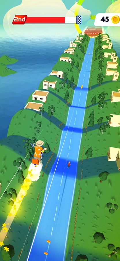 «Увлекательное приключение в горах! Гонка с другими велосипедистами по горной дороге! Взлетайте и касайтесь неба! Вовремя нажимайте на экран и отпускайте во время движения.