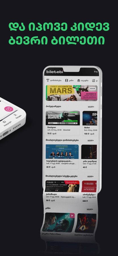 Biletebi.Ge is a national ticketing operator in Georgia and gives you access to all kinds of entertainment, events, theaters, cinemas, railway, transport and museums and makes it easy to buy and get in using your mobile phone e-ticket instead of printed one.