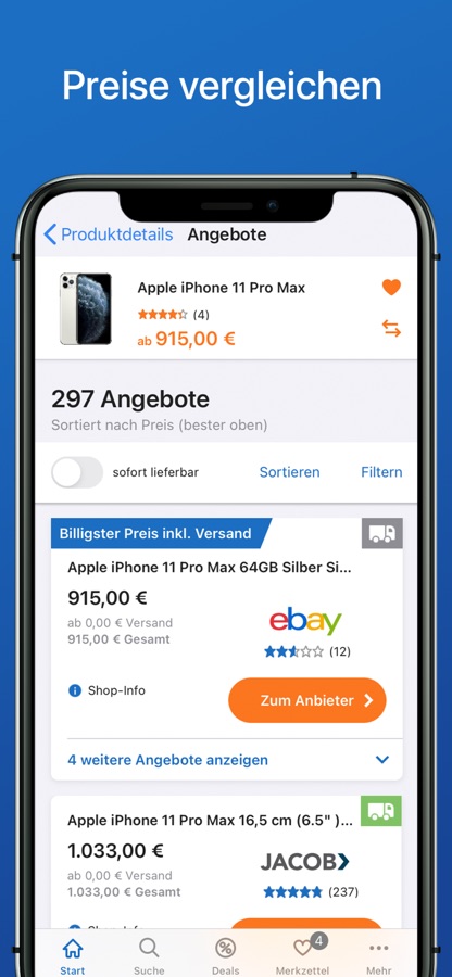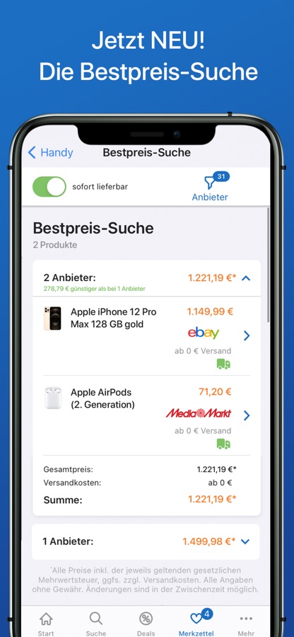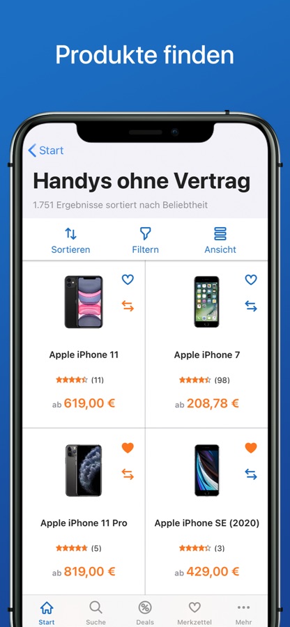 Mit der Preisvergleich-App können Sie die Top-Angebote auf einem Merkzettel speichern. So behalten Sie die Angebote zu Ihren Wunschprodukten jederzeit im Auge und Ihnen entgeht kein Deal mehr. Stöbern Sie in der großen Auswahl an Handys, Tablets, Autoteilen, Fernsehern, Spielekonsolen, Kühlschränken, Kaffeemaschinen, Medikamenten und vielem mehr.