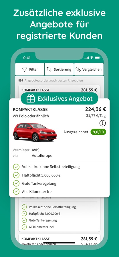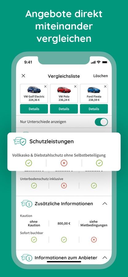 • Auf einen Blick vergleichst Du in unserer App bis zu drei Mietwagen-Angebote miteinander. Spare Dir das Wechseln zwischen den Tabs und finde Deinen Favoriten unter hunderten von Autos jetzt noch schneller.