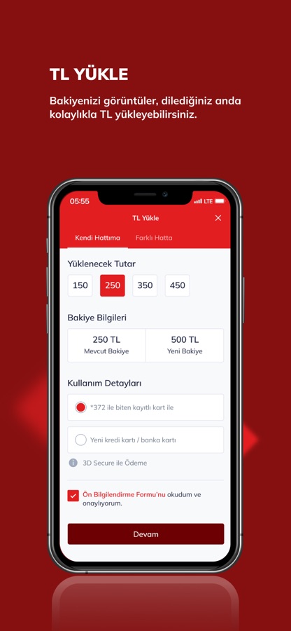 • İşlemler menüsünden paket bilgi sorgulama, TL yükleme ve TL talep etme işlemlerine, hat ve çağrı ayarlarını yönetme gibi ihtiyacınız olan tüm işlemlerinizi kolaylıkla ve güvenle gerçekleştirebilirsiniz.