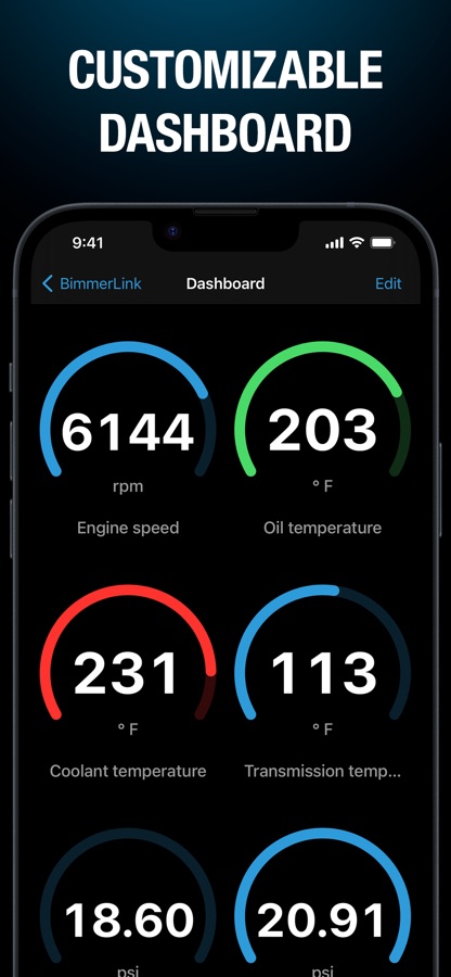 BimmerLink provides a big selection of values like oil temperature or boost pressure. Keep an eye on all the important parameters of your car with a personalized dashboard.