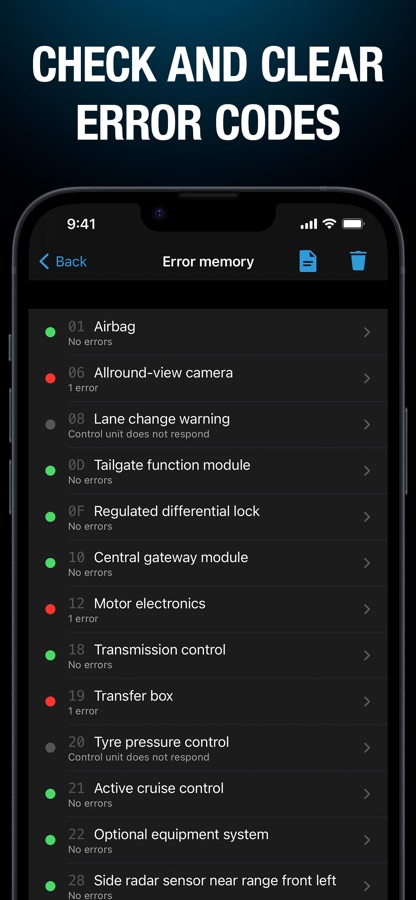 Diagnose your car as would otherwise be possible only by your Service Partner. In contrast to generic OBD apps that read emission related errors only, BimmerLink allows you to read and clear trouble codes from ALL control units in your car.