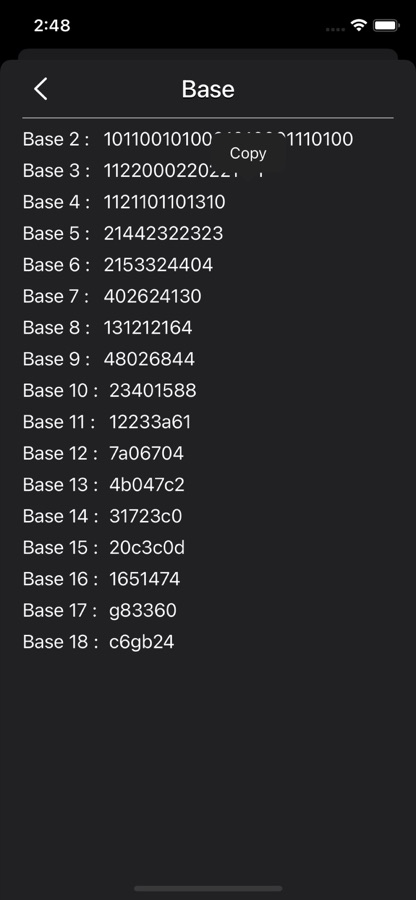 This app is so designed that you can input the number in any of the number format (e.g. decimal) and it will convert it to the rest of the formats (i.e. Binary, Hexadecimal, Octal)