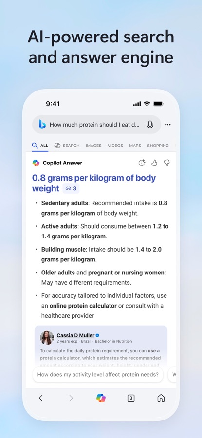 Copilot Search in Bing brings intelligence to search so you can spend less time searching and more time discovering. Depending on your query, you’ll get an easy-to-scan layout of information, a summary of the most critical points, or a clear answer. No more hunting across the web.