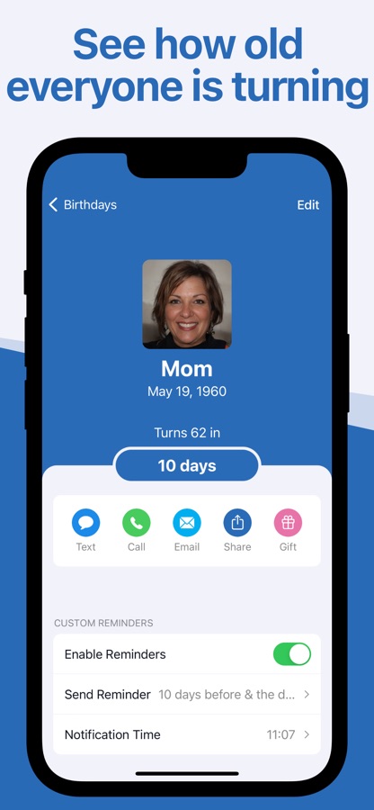 «Just what I’ve been searching for. I’ll never miss a birthday again with the notifications and widget. I like that it tells me how old the person will be so I can plan for milestone birthdays. Just perfect.» — by kat3748