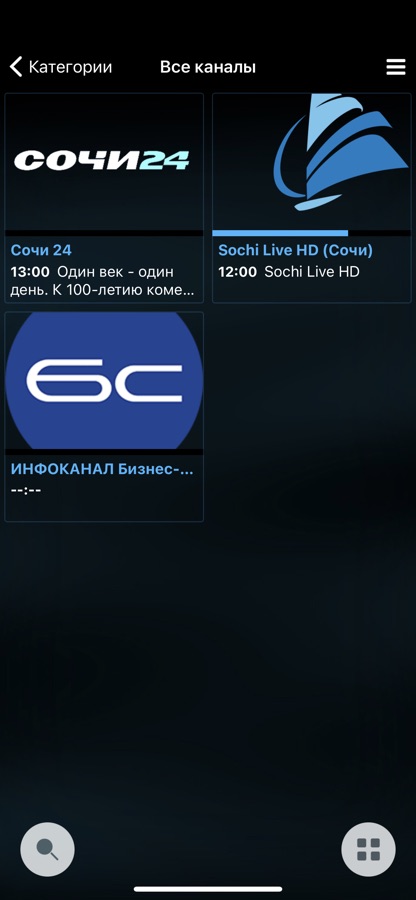 Данное приложение BISV.TV mobile разработано для смартфонов и планшетов на базе iOS. Помимо классической навигации реализованы управление жестами и голосовые команды. В настройках пользователь может выбрать стиль представления телеканалов: плитка, либо список. Имеется раздел «Избранное», куда можно добавлять понравившиеся телеканалы. Для внешних пользователей, не подключенных к сети «Бизнес-Связь», доступны для просмотра два сочинских телеканала: Сочи 24 и Сочи Лайв.